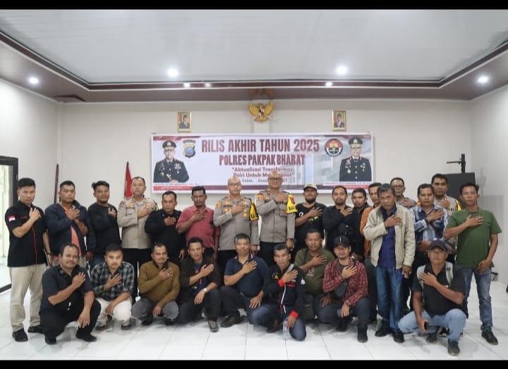 Pakpak Bharat – Polres Pakpak Bharat melaksanakan kegiatan Rilis Akhir Tahun 2025 di aula Catur Prasetya Mapolres Pakpak Bharat, Selasa 30 Desember 2025. Kapolres Pakpak Bharat AKBP Pebriandi Haloho memaparkan berbagai kegiatan dan capaian Polres Pakpak Bharat selama tahun 2025.