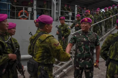 Surabaya – Komandan Brigif 2 Marinir, Kolonel Marinir Aang Andy Warta, M.Tr.Opsla., menghadiri upacara penyambutan Satgas Pamtas RI-PNG Mobile Papua di Dermaga Madura Koarmada II, Ujung, Surabaya, Senin (05/01/2026). Penyambutan pasukan Satgas dipimpin Wakil Komandan Pasmar 2 Brigjen TNI (Mar) Arinto Beny Sarana, S.E., M.M., sebagai Inspektur upacara.