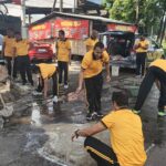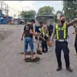 Sidoarjo – Personel Polsek Krian Polresta Sidoarjo menunjukkan respons cepat dengan melakukan penanganan sementara jalan berlubang di Jalan Raya Krian yang berpotensi