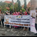 Sidoarjo – Aliansi Jurnalis Sidoarjo (AJS) bersama jajaran Polsek Buduran membagikan ratusan paket takjil kepada pengguna jalan di depan Museum Mpu Tantular,